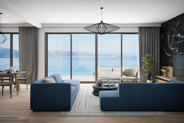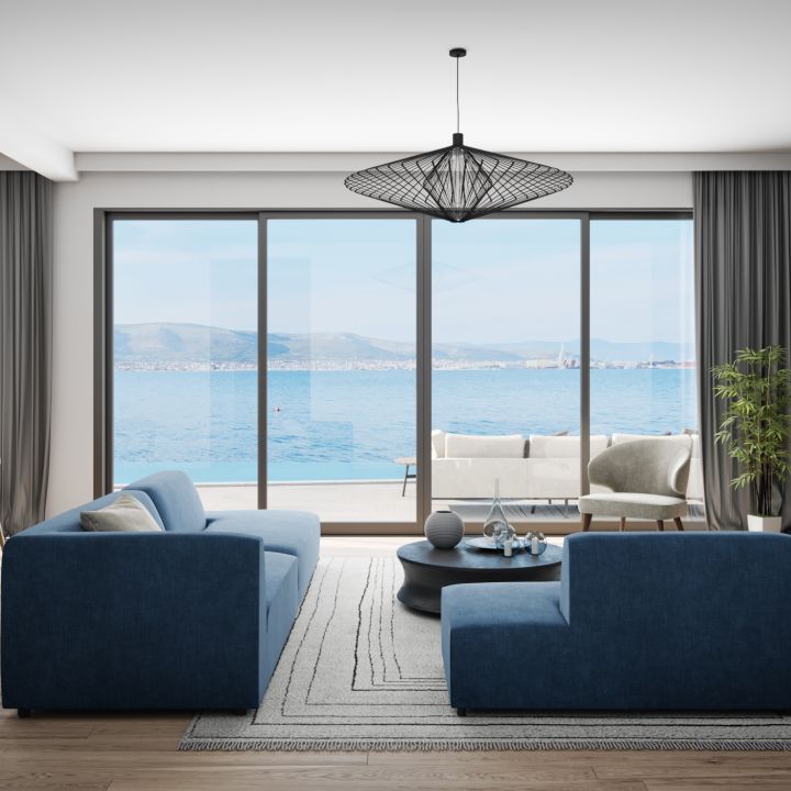 You can admire the breathtaking view of the sea and the opposite coast from the terrace fitted with an 11-meter-long heated pool. Thanks to the floor-to-ceiling aluminum picture windows, this unique view stays within your sight, even if you are standing in the living or dining room of 84 m2 total area.