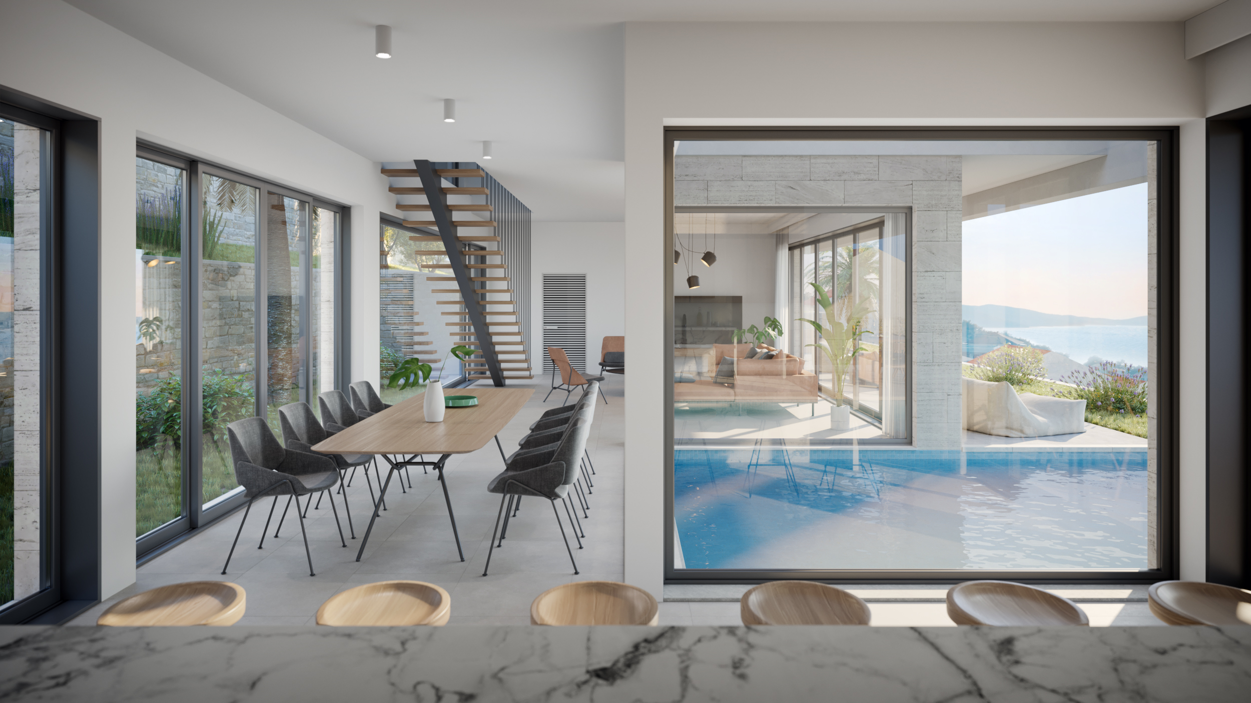 The lush greenery around the residence, along with the architecture of the building, create a coherent whole.