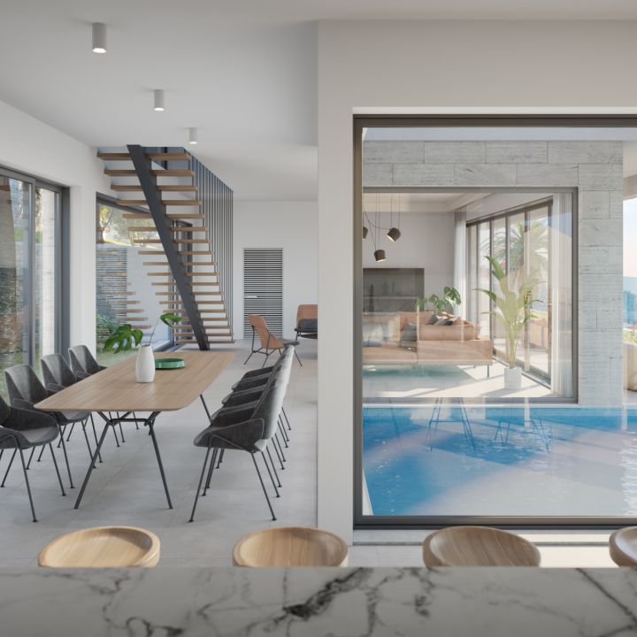 The floors are tiled with extra-large, elegant ceramic tiles and paneled with high-quality wood flooring. Thanks to their hidden frames, large windows and interior doors perfectly blend in with walls’ surfaces. The fitting ideally matches the modern interior design of this exclusive villa.