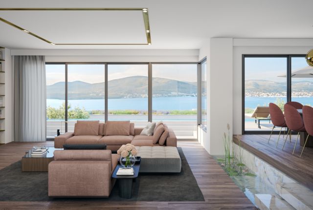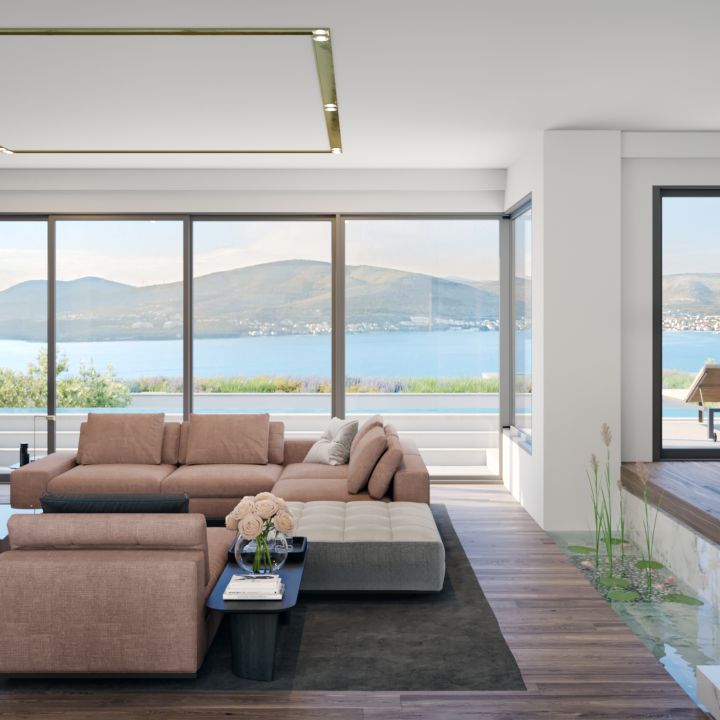 Also, the interior is dominated by stark rectangles and minimalistic forms in compliance with modern architecture. The floors are covered with precious 120x240 cm ceramic tiles and wood flooring. The doors with hidden frame, along with large-format windows’ fronts, ideally fall into the pattern of the villa’s exclusive design.