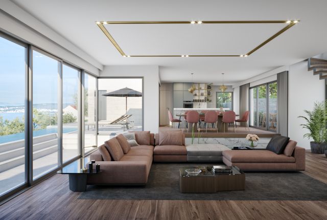 The 320 m2 living area consists of 5 bedrooms with attached elegant bathrooms. On the ground floor, you will come across the living and dining room, including a fully stocked kitchen. All those three rooms offer the view, which edges its way directly above the pool and straight to the shiny, sky-blue sea.